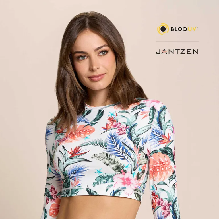 Jantzen HAWAIIAN TERRACE CROPPED SWIM RASH GUARD TEE TOP^ Uv Apparel|Floral Print Suits