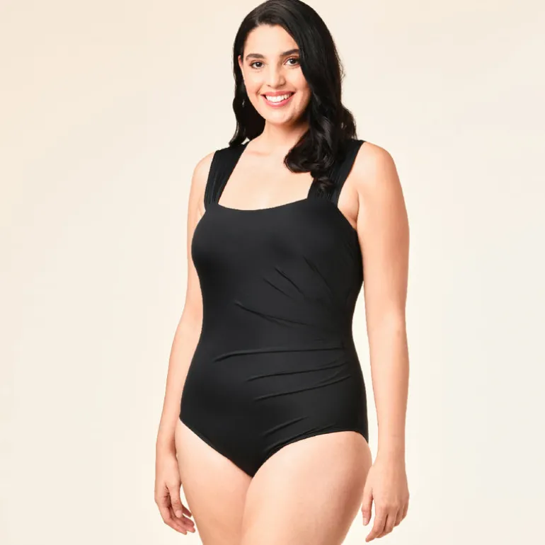 Our Glamour Square Neck One Piece is the suit you can’t live without. With a flattering square neckline and wide straps that can be worn as a cap sleeve, tummy control and side shirring, this suit is guaranteed to flatter your figure.
